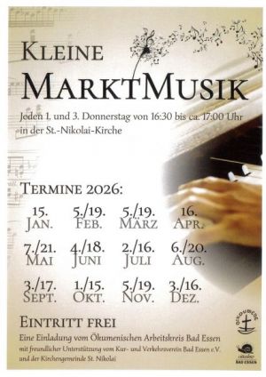 Die fünf ökumenisch verbundenen Kirchengemeinden in Bad Essen laden zu einem besonderen musikalischen Angebot ein. An jedem ersten und dritten Donnerstag im Monat findet um 16:30 Uhr während der Marktzeit ein circa 20 bis 30-minütiges Konzert in der evangelisch-lutherischen Kirche St. Nikolai in Bad Essen statt. Dazu werden kurze Texte gelesen, mal besinnlich, mal heiter oder nachdenklich. Die Veranstaltung bietet eine Gelegenheit zum Entspannen und ist kostenfrei. Die Kirche ist für alle ab 15 Uhr geöffnet.